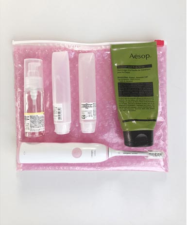 I always transfer my facial cleanser, hair serum and shampoo to Muji travel refill bottles.