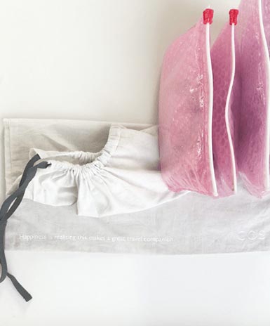 If you are using a bra that has cups, never flatten the cups. You should pack them on top. If you are wearing soft bras, you may fold them and pack them upright in the fabric bag, together with the knickers and socks.